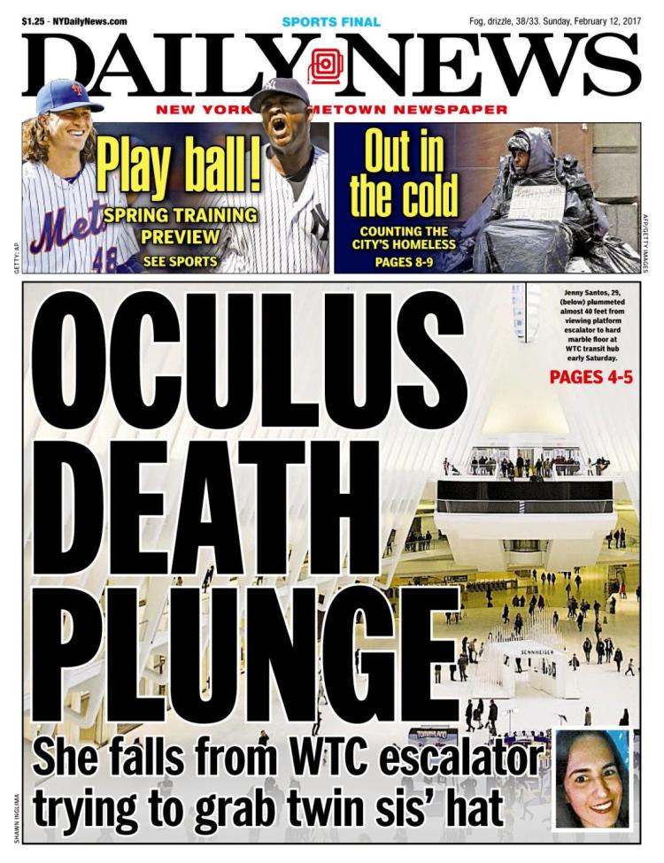 A security guard at the World Trade Center Oculus in Lower Manhattan didn’t assist a woman who fell to her death moments later while trying to retrieve her twin sister’s hat, the New York Daily News reported. Jenny Santos, 29, who was on her way to