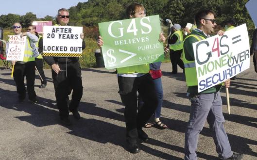 G4S locked the workers out after their contract expired and they rejected a proposed new contract. The union said the company wants to change the employees’ health plan, which it said would result in higher costs and less coverage for workers.