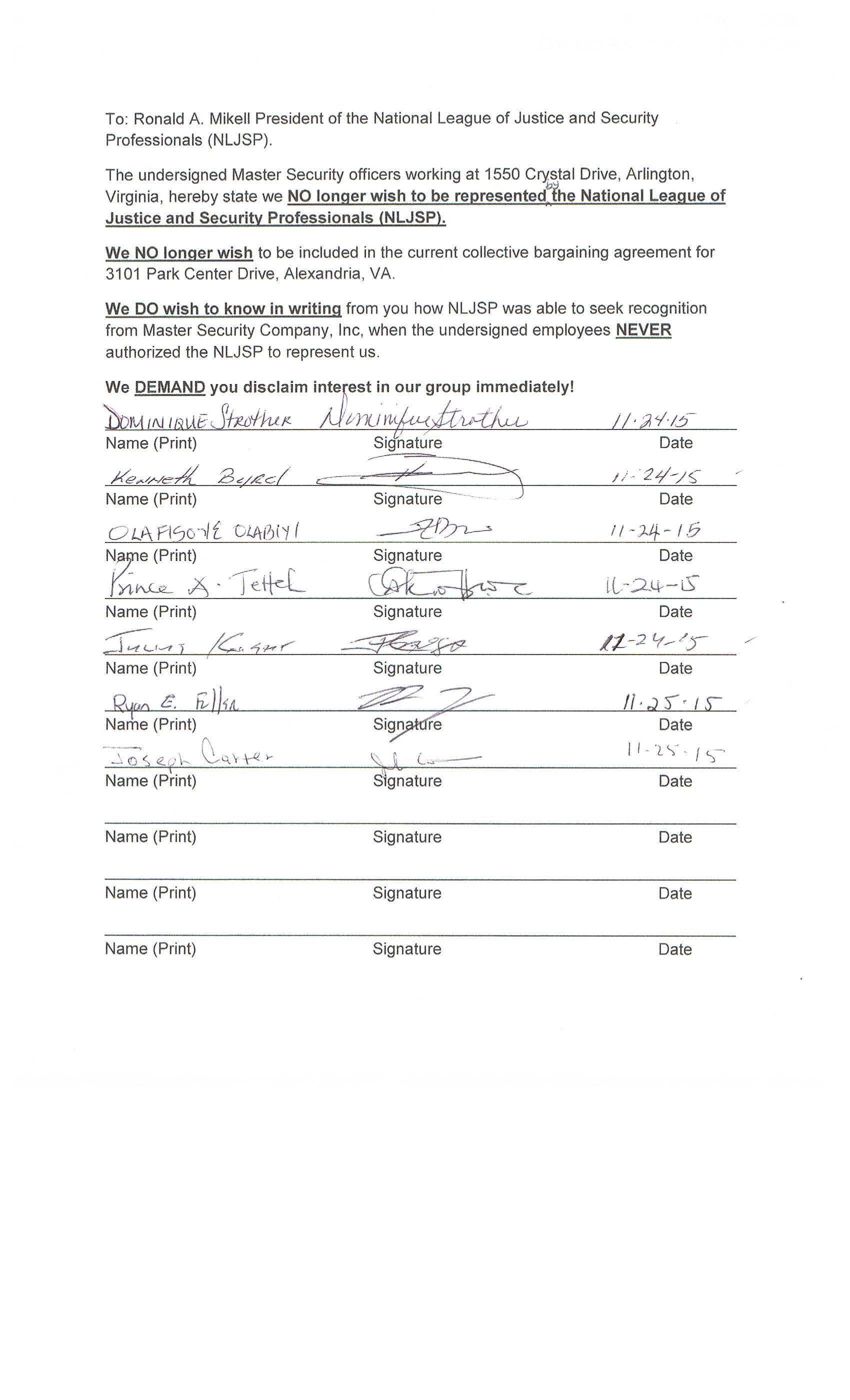 As the lead representative of the PSO collective body at 200 C Street SW FOB-8, I hereby reject the Union of the National League Of Justice And Security Professionals (NLJSP) as the representative body in all matters concerning the collective bargaining agreement between Paragon Systems and the incumbent PSO force of 200 C Street SW FOB-8. We will exercise our right to elect a new union during this option year. Any further actions taken by NLJSP without the consent of the representative body will be noted as a illegal action and the National Labor Relations Board will be notified immediately.