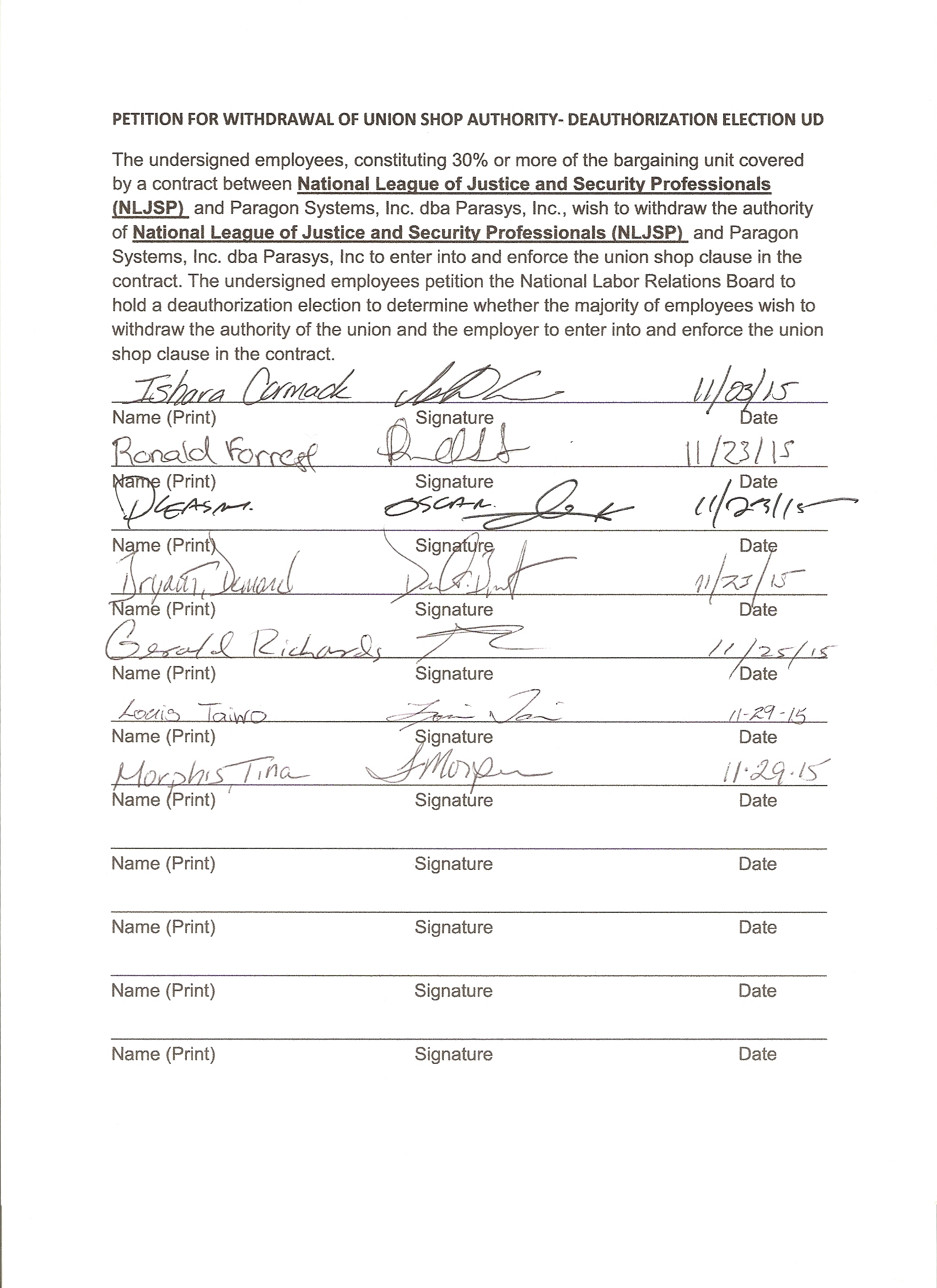 72 Paragon Systems, Inc. Security Officers VOTE to Decertfy the National League of Justice and Security Professionals (NLJSP). The NLJSP received only 1 Vote in this election.